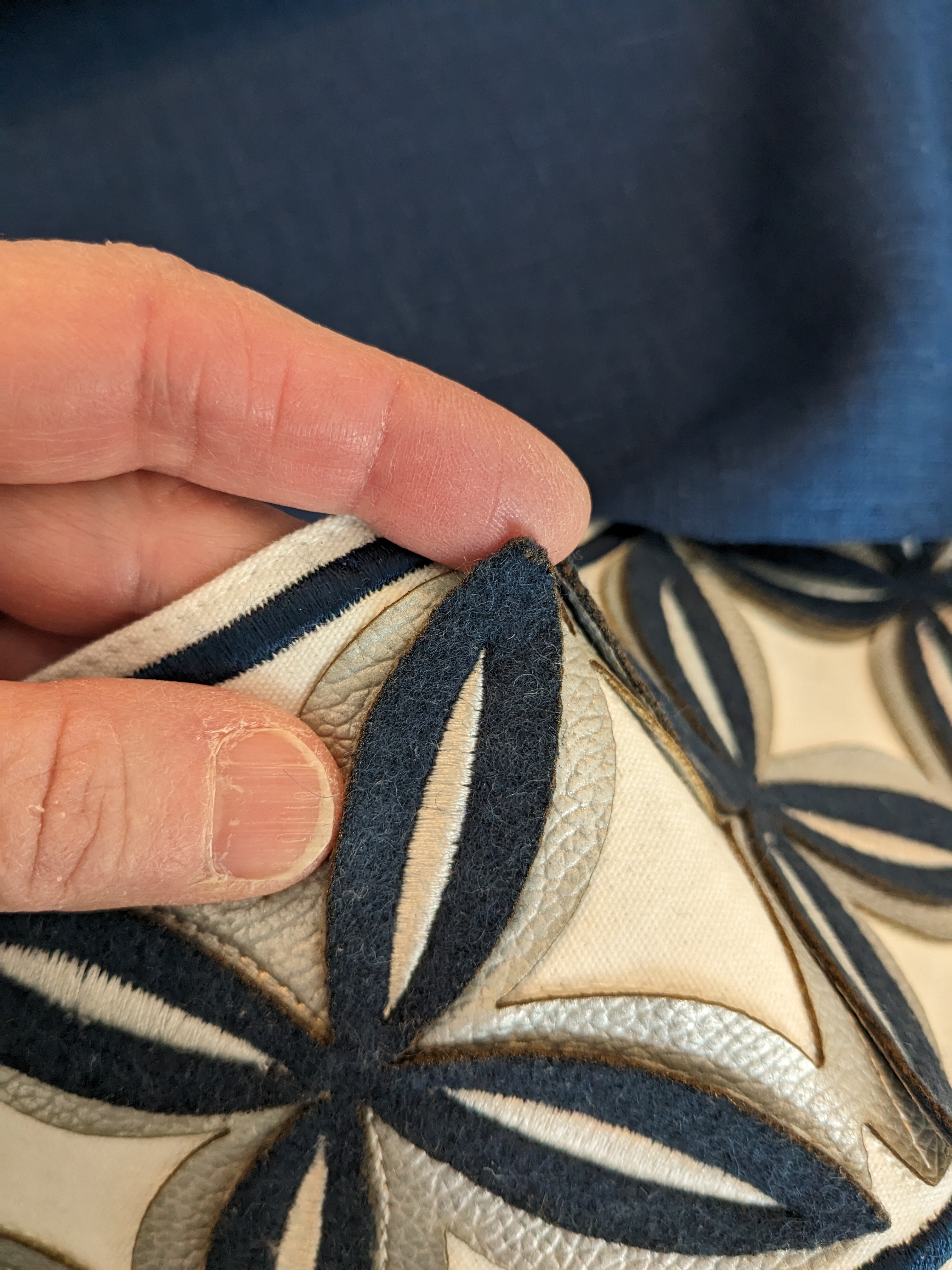 One aspect of our job as soft furnishings fabricators is problem solving. These pillows are a case in point. The designer chose a thick trim with leather appliques to be placed on a cover made of thin weight linen.